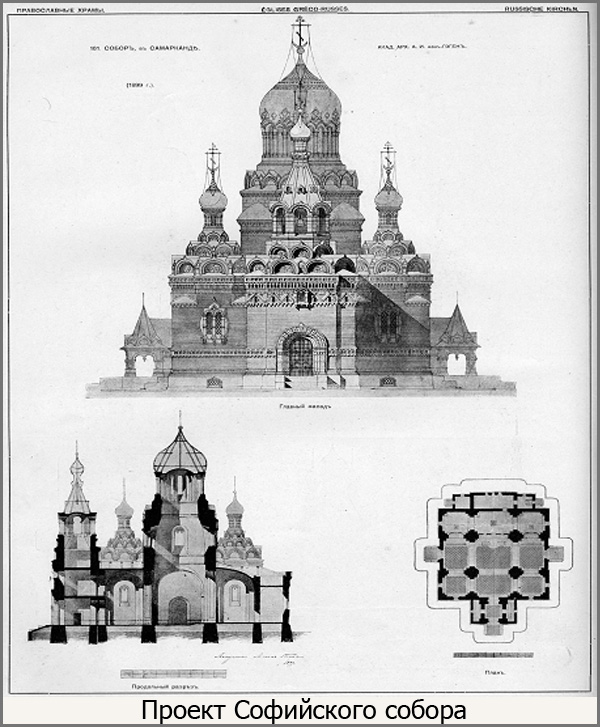 В 1888 году впервые возникает вопрос о строительстве в Самарканде главного городского собора на 1500 душ. (Справочная книга Самаркандской области. 1900 год.) Городские власти планировали выстроить Софийский храм, превосходящий своими размерами и высотой все, уже существующие в городе, архитектурные сооружения. У этого собора должно было быть два придела, один во имя Георгия Победоносца, а другой во имя святителя Николая Чудотворца. И тогда, в 1890 году из г. Одессы был прислан план собора, составленный академиком архитектуры С. Толвинским. В 1899 году был представлен ещё один проект собора, составленный тоже академиком архитектуры А.И. фон-Гогеном. Интересно, что в его проекте были использованы мотивы архитектуры среднеазиатского средневекового города. Ещё была новаторская для того времени идея — выстроить этот собор из бетона. Очень долго специалисты не могли определиться с местом под постройку такого большого сооружения, изыскания и пробы производились в разных местах города в течении нескольких лет. В итоге место для Софийского собора было выбрано на возвышенности в Ивановском парке. Для осуществления этой идеи был создан специальный Строительный комитет, а так же были собраны огромные деньги (250.000 рублей) и закуплены все необходимые стройматериалы. В сентябре 1912 года Самарканд посетил только что назначенный на Туркестанскую кафедру владыка — Архиепископ Иннокентий (Пустынский). Процессия, возглавляемая владыкой в сопровождении самаркандского благочинного, духовенства и большого стечения православных, прошла крестным ходом от ближайшей церкви к месту «уготованному и велелепно украшенному цветами» (РГИА ф. №796, оп. 442, дело 2553, л. 20.). На возвышенном месте в Ивановском парке владыка осуществил чин закладки этого собора. Но, в итоге, всем этим планам так и не суждено было осуществиться. Материалы, заготовленные для строительства Софийского собора, были распроданы.