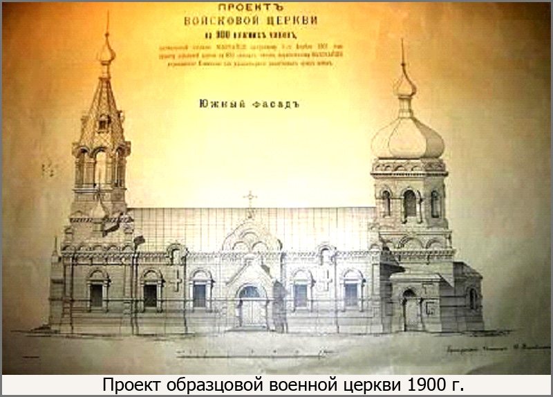 В 1900 году, Военный Министр Российской Империи — А.Н. Куропаткин составил на Высочайшее имя доклад, с предложениями по улучшению быта нижних чинов, в котором он писал, что в настоящее время: «представляется необходимым изыскать средства для постройки церквей при всех частях войск, в которых по штату положены священники, и для расширения существующих войсковых храмов, для чего необходимо разработать тип военной церкви, хотя бы барачной системы, но поместительной и недорогой, чтобы изысканием для постройки церквей средств не пришлось откладывать удовлетворение этой насущной нужды»….
