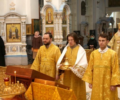 Его Высокопреосвященству сослужили: протоиерей Павел Сергеев, иерей Александр Боготобин, иеромонах Иов (Коннов), иерей Александр Боготобин, диакон Михаил Межовиков, диакон Рустик Ковалев, диакон Петр Гнатик, иеродиакон Мефодий (Абдусаидов).
